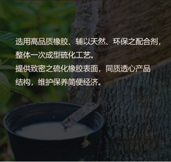 選用高品質(zhì)橡膠、輔以天然、環(huán)保之配合劑,整體一次成型硫化工藝。提供致密之硫化橡膠表面,同質(zhì)透心產(chǎn)品結(jié)構(gòu),維護(hù)保養(yǎng)簡(jiǎn)便經(jīng)濟(jì)。 Choose high-quality rubber, supplemented by natural, envi